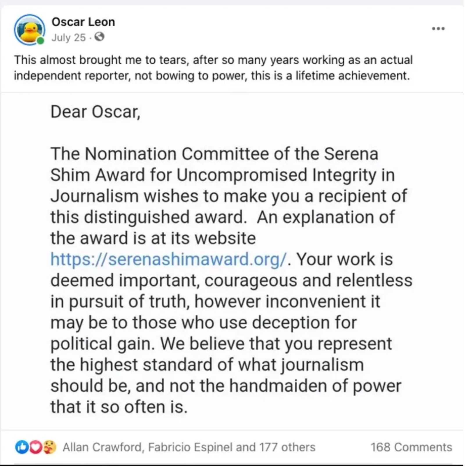 for more info about the award: https://serenashimaward.org/